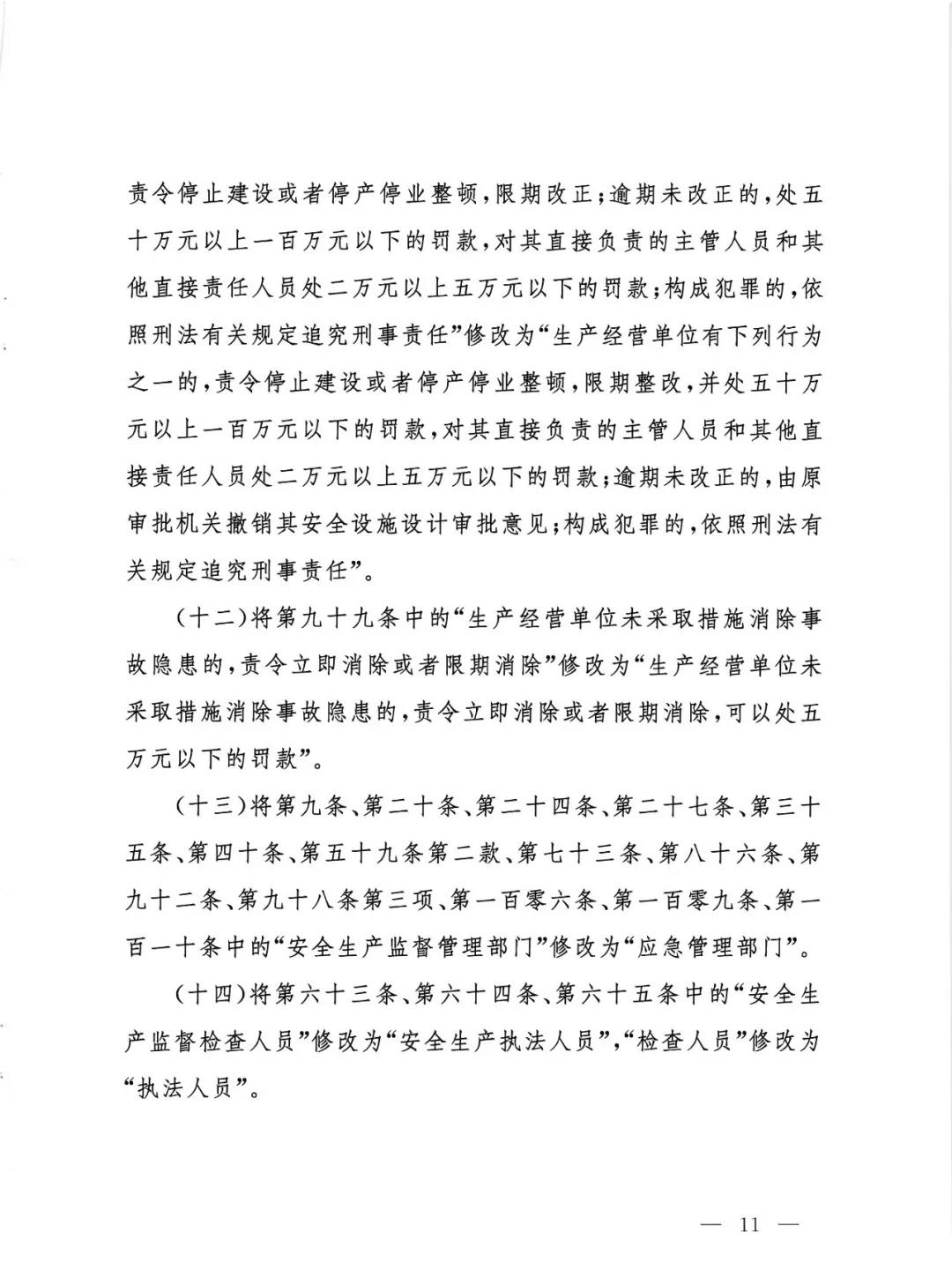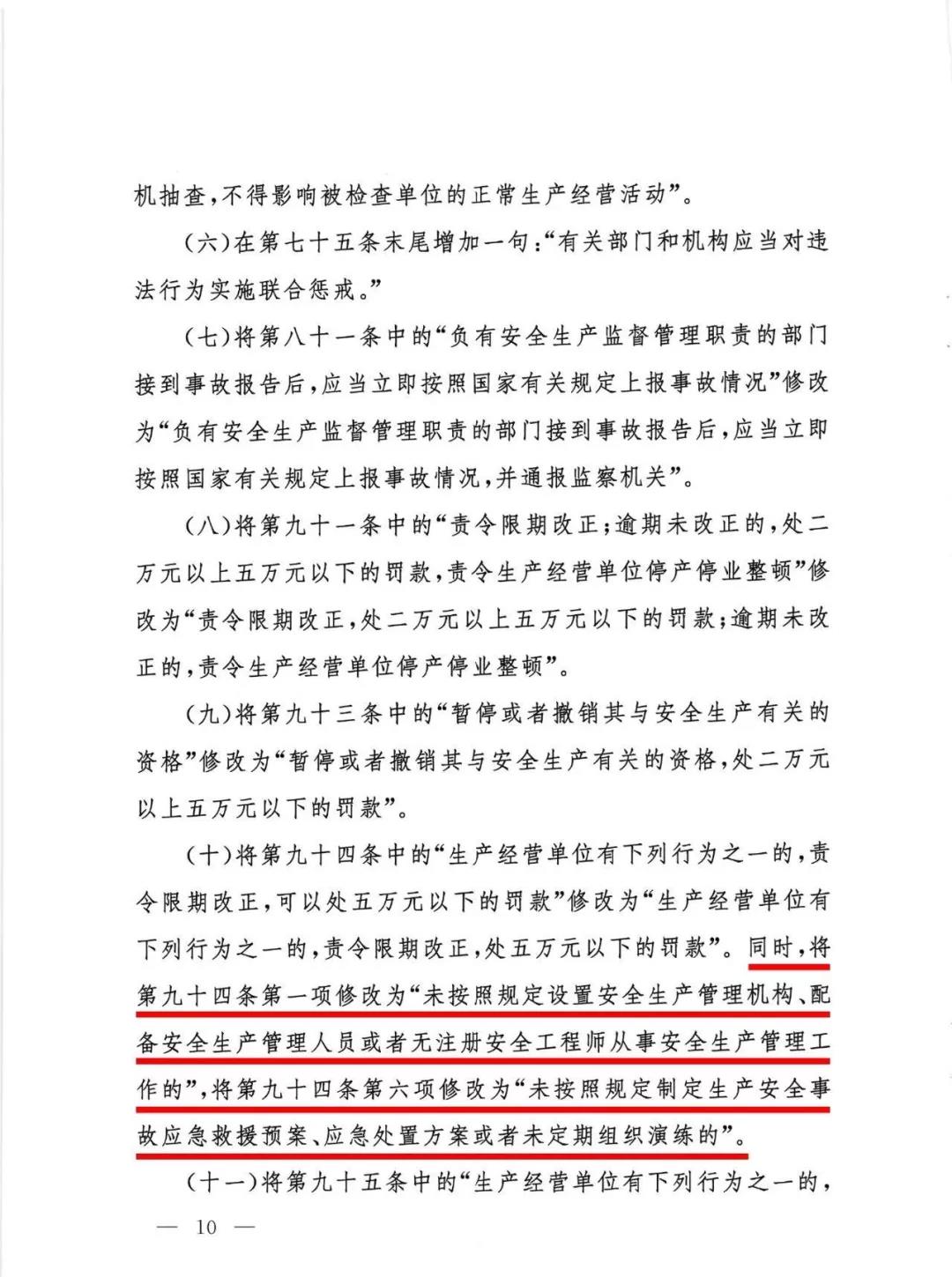 1、将第九十四条第一项修改为:“未按照规定设置安全生产管理机构、配备安全生产管理人员或者无注册安全工程师从事安全生产管理工作的”
