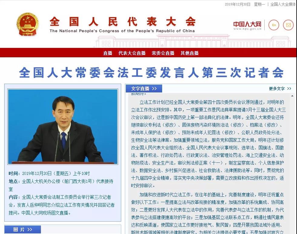 12月20日,全国人大常委会法工委举行第三次记者会。会上,全国人大常委会法工委发言人岳仲明向记者介绍了全国人大常委会2020年立法工作安排。
