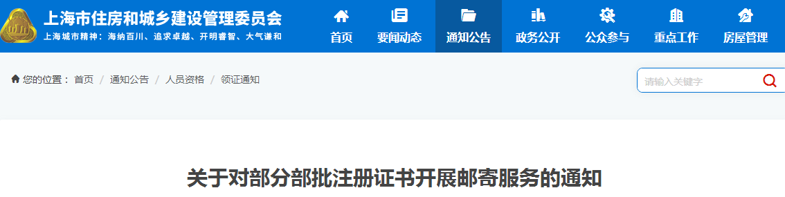 为降低新冠肺炎疫情传播风险,有效减少人员聚集,阻断疫情传播,即日起至新冠肺炎疫情结束,上海市住房和城乡建设管理委员会行政服务中心(以下简称市住建委行政服务中心)对部分部批注册证书开展邮寄服务,暂停现场领取证书。现通知如下:
