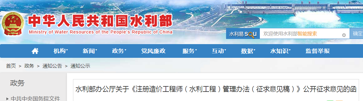 水利部发布《注册造价工程师(水利工程)管理办法(征求意见稿)》公开征求意见的函