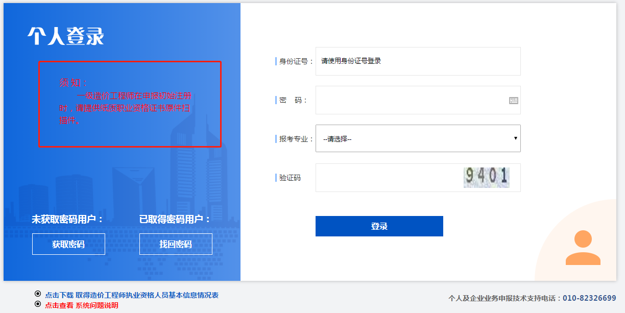 从中国建设工程造价管理系统,点击进入“一级注册造价工程师”。在个人登陆页面,官方发布提醒:一级造价工程师在申报初始注册时,请提供纸质职业资格证书原件扫描件。