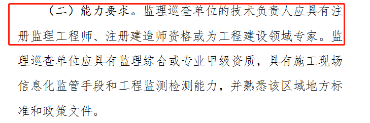 3、能力要求:监理巡查单位的技术负责人应具有注册监理工程师、注册建造师资格或为工程建设领域专家。监理巡查单位应具有监理综合或专业甲级资质,具有施工现场信息化监管手段和工程监测检测能力,并熟悉该区域地方标准和政策文件。