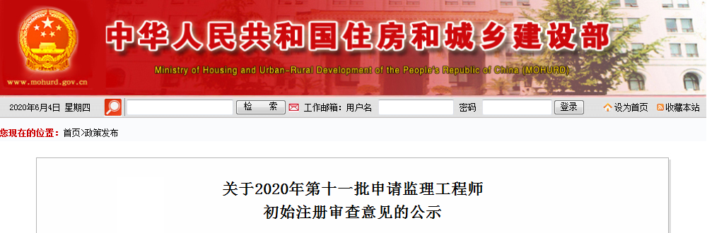 住建部公布2020年第十一批申请监理工程师初始注册审查意见