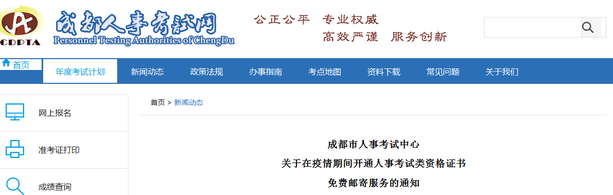 近日,成都人事考试中心发布了关于在疫情期间开通人事考试类资格证书免费邮寄服务的通知,《通知》指出,市考试中心至6月11日9:00起,就疫情期间对全市各类专业技术资格、职业(执业)资格、职称资格证书开通免费网上申请邮寄服务,邮寄费用由成都市人事考试中心统一支付。