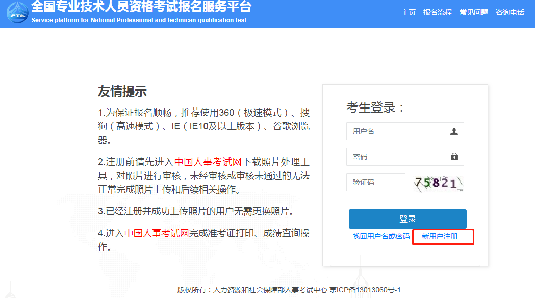 注意:注册前请先进入中国人事考试网下载照片处理工具,对照片进行审核,未经审核或审核未通过的无法正常完成照片上传和后续相关操作。
