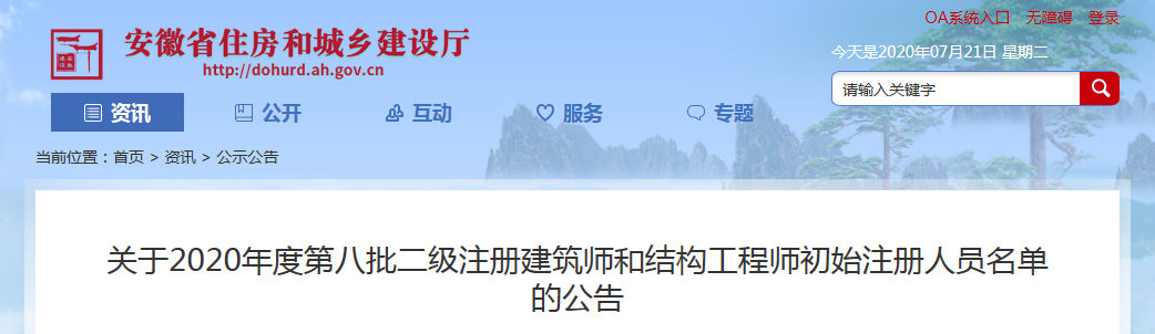 安徽省关于2020年度第八批二级注册建筑师和结构工程师初始注册人员名单的公告