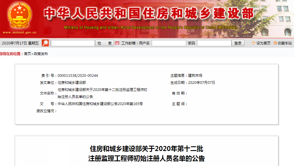 住建部公布2020年第12批注册监理工程师初始注册人员名单