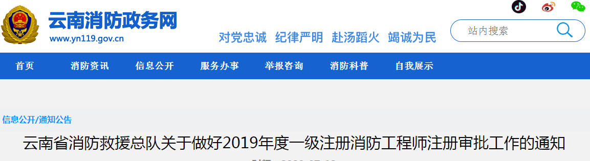 云南省消防救援总队关于做好2019年度一级注册消防工程师注册审批工作的通知