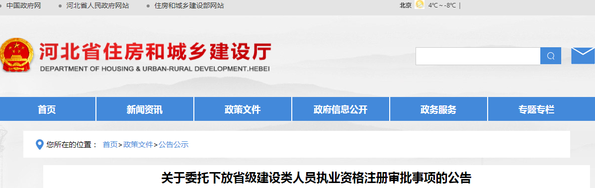 近日,河北省住建厅发布了关于委托下放省级建设类人员执业资格注册审批事项的公告。