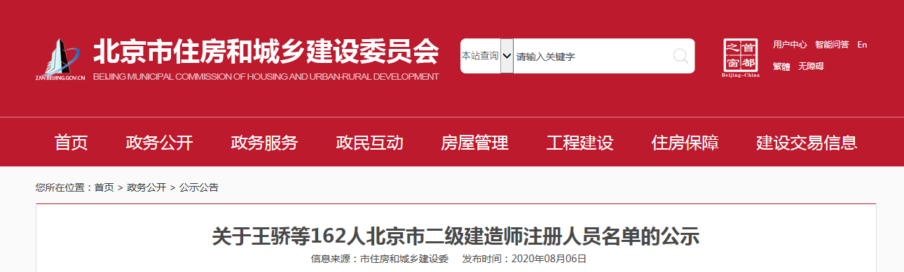 关于王骄等162人北京市二级建造师注册人员名单的公示