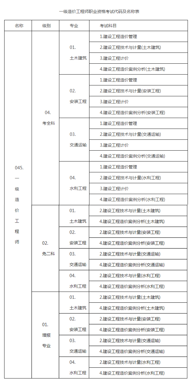 2.一级造价工程师职业资格考试代码及名称表