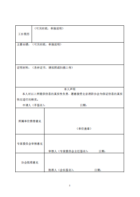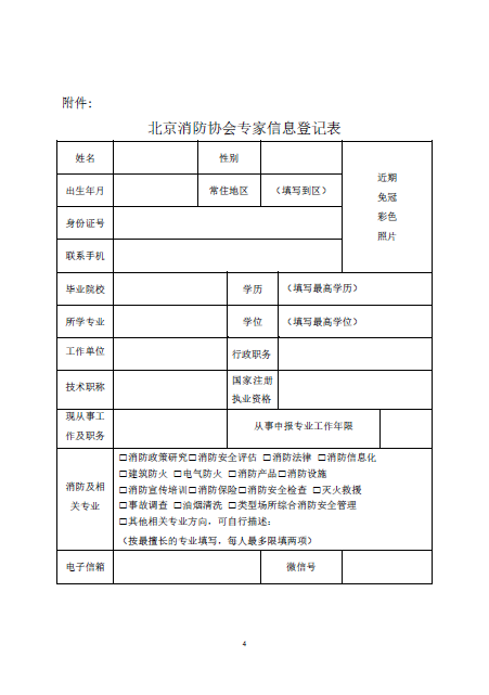 申请人请于6月20日前,将以上材料电子版报送至互联网邮箱 18201273087@163.com。其中,《北京消防协会专家库专家申请表》需经申请人员所在单位签署意见并盖章后(已退休人员不需单位推荐,直接报协会),再上传扫描件。