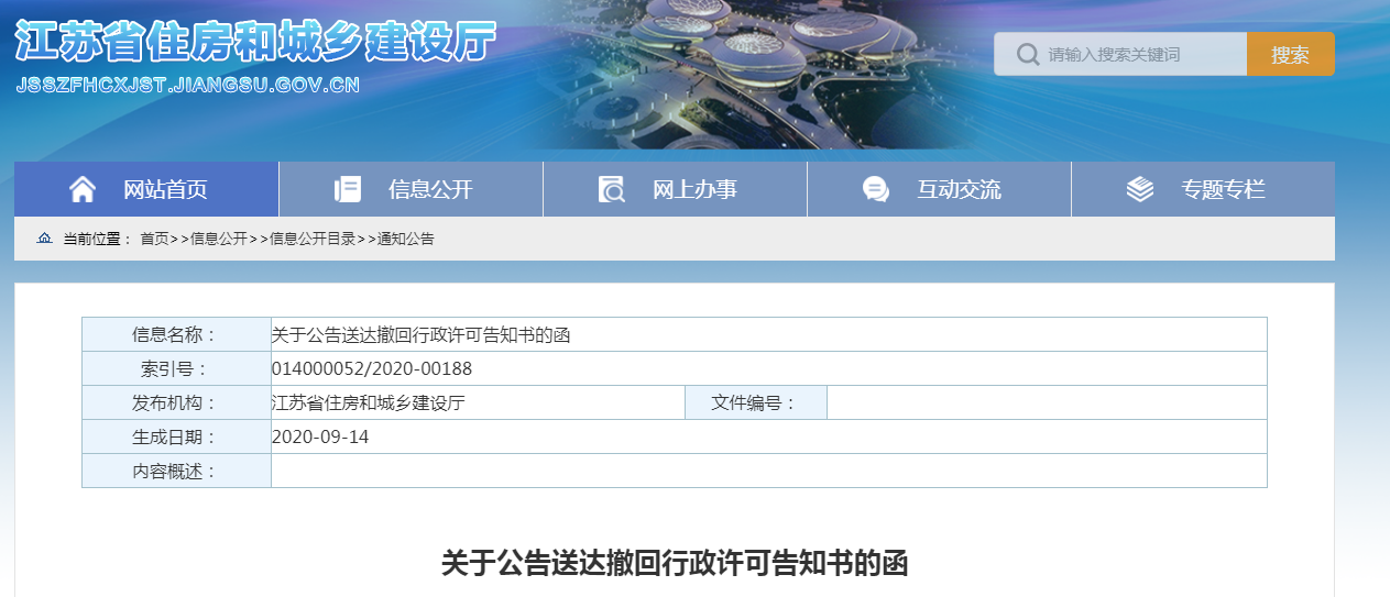 近日,江苏省住建厅发布了关于公告送达撤回行政许可告知书的函,函件中指出,江苏省住建厅经过核查证明,江苏海鹏工程项目管理有限公司单位注册人员数量不满足房屋建筑工程监理乙级、市政公用工程监理乙级资质标准要求并且未在规定期限整改,拟予以撤回单位的房屋建筑工程监理乙级、市政公用工程监理乙级资质的处理。