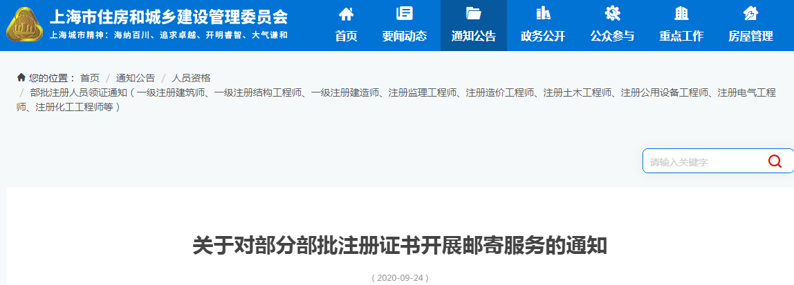 上海市住建委对部分部批注册证书开展邮寄服务通知(9.24)