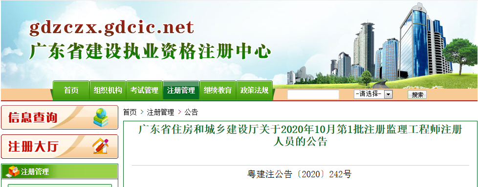 广东省住房和城乡建设厅关于2020年10月第1批注册监理工程师注册人员的公告