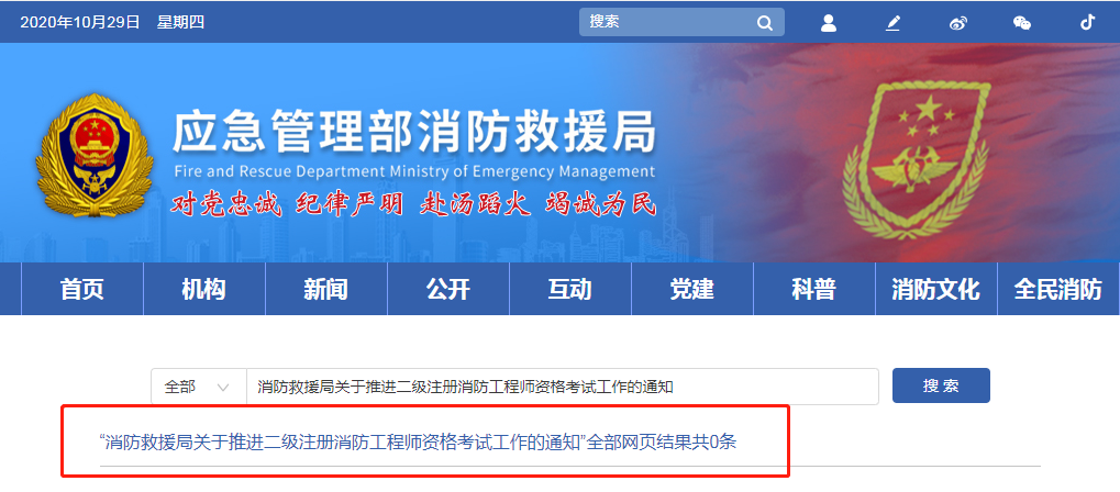 为了核实通知情况,大立教育特意从应急管理部消防救援局官网上进行搜索,但是并没有看到相关文件,由于此通知的真实性尚未确定,希望了解相关信息的各位可关注大立教育,我们会关注官方通知为大家更新二级消防工程师考试最新动态。