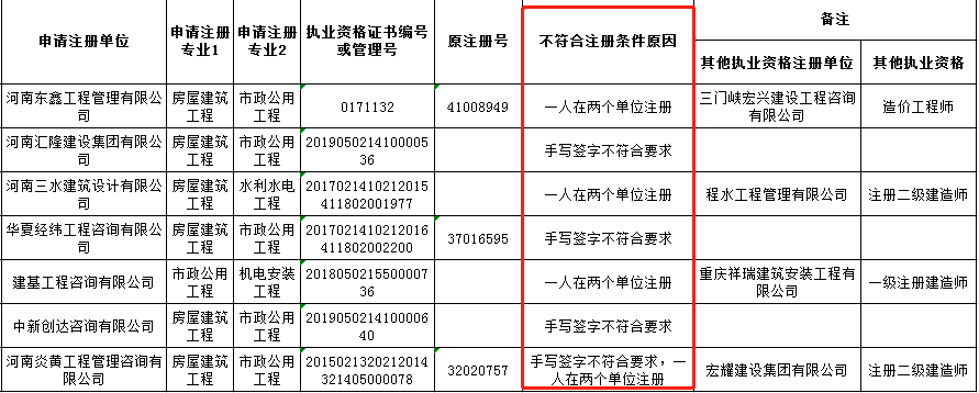 根据公示的名单分析,不符合条件的原因主要有2个:一是手写签字不符合要求,有61人,约占77%;二是一人在两个单位注册,有13人,约占16%。