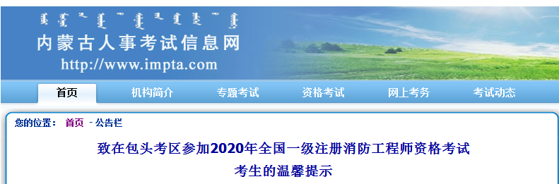 近日,内蒙古人事考试网发布了致在包头考区参加2020年全国一级注册消防工程师资格考试考生的温馨提示,提示指出:
