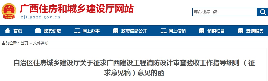 近日,广西省住建厅发布了关于征求广西建设工程消防设计审查验收工作指导细则 (征求意见稿)意见的函,《函件》指出,省住建厅面向社会征求消防设计审查验收工作指导细则,意见征求截止于2020年11月13日。