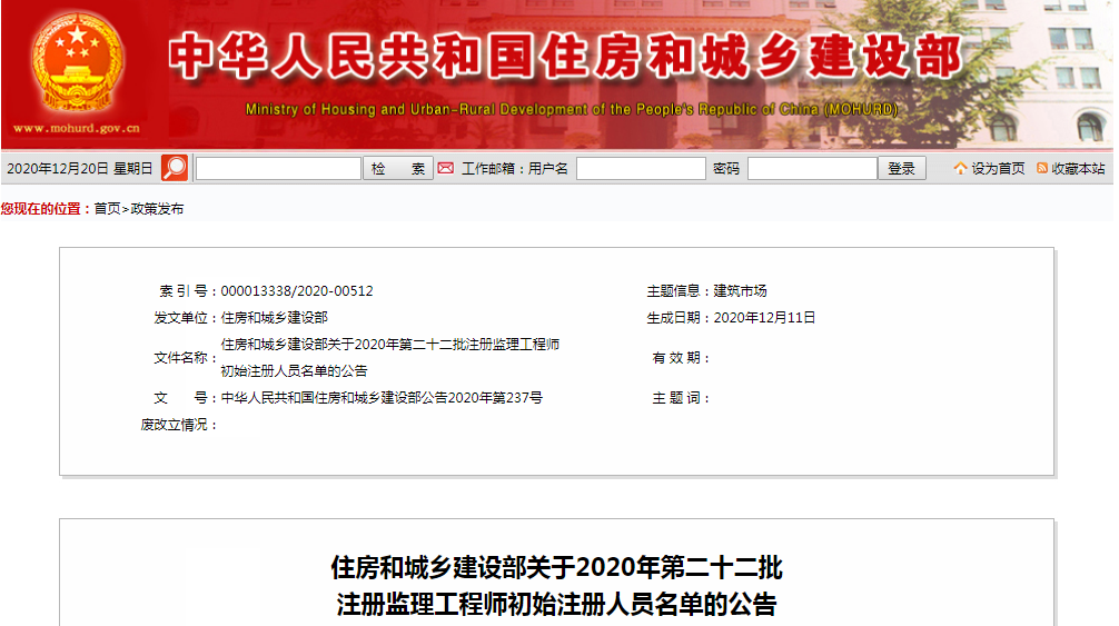 住建部公布2020年第22批注册监理工程师初始注册人员名单