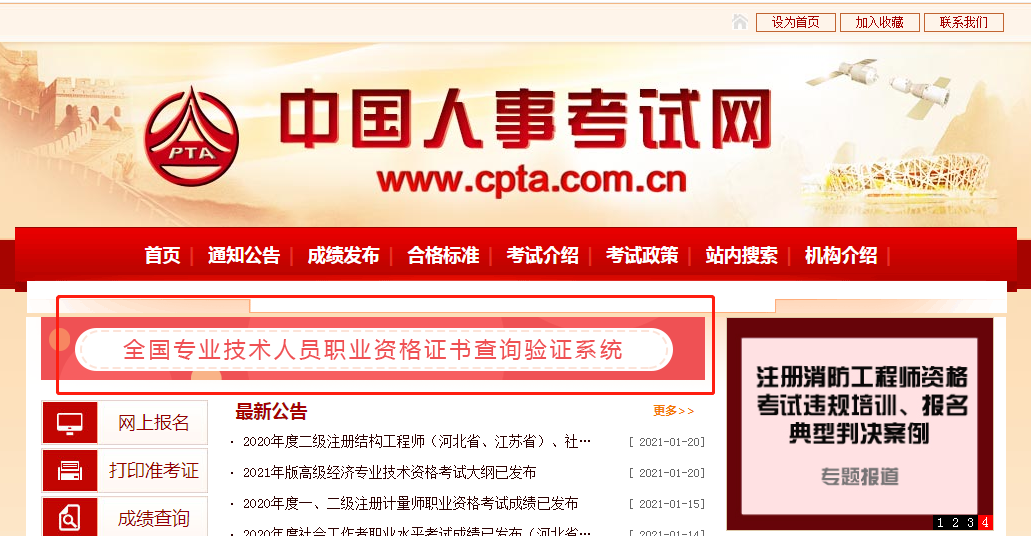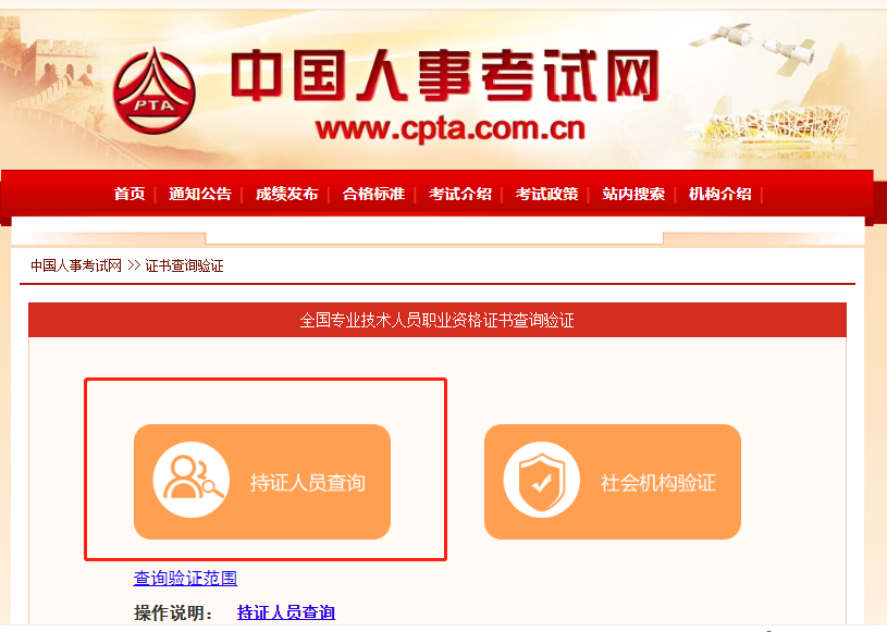 在中国人事考试网资格证书模块,选择“全国专业技术人员职业资格证书查询验证”,选择“持证人员查询”,进入系统首页。