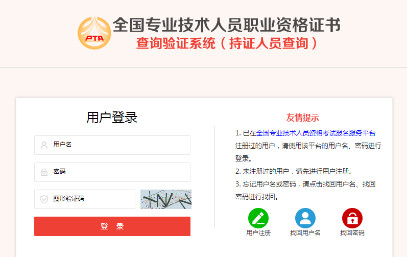 全国专业技术人员职业资格证书查询验证系统与全国专业技术人员资格考试报名服务平台共享注册信息,已在全国专业技术人员资格考试报名服务平台注册过的用户,请使用该平台的用户名、密码登录证书查询验证系统。注意:首次登录系统时,必须阅读并同意服务须知,才能继续操作。