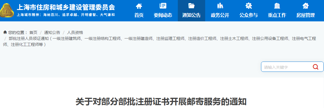 上海市对一建、监理、造价等部分部批注册证书开展邮寄服务的通知