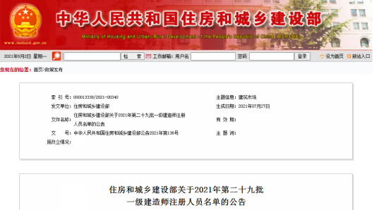 住房和城乡建设部关于2021年第二十九批一级建造师注册人员名单的公告